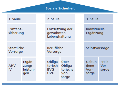 Das schweizerische System der sozialen Sicherheit baut auf dem 3-Säulen-Prinzip auf. Die staatlichen Sozialversicherungen (AHV, IV, Arbeitslosenversicherung etc.) sind Bestandteil der 1. Säule.