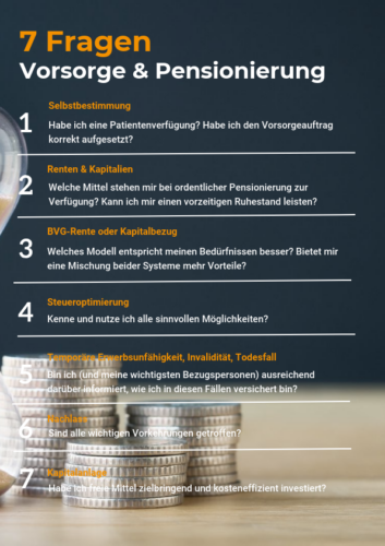 Sind Sie ausreichend über die wichtigsten Punkte rund um Ihre Vorsorge und Pensionierung informiert? In Zusammenarbeit mit unserem Partner, denn Vorsorgeexperten Villars & Villars, haben wir für Sie die wichtigsten sieben Fragen zusammengestellt.